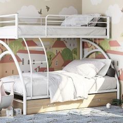 Конструкция кровати предусматривает спальные места разных размеров: верхнее 90*190 см и нижнее 120*190 см. Верхний ярус защищен прочными бортиками. Лестницу можно установить с любой стороны. Кровать оборудована большим выкатным ящиком для белья или дргих вещей.