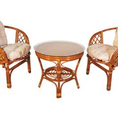 Комплект из натурального ротанга, состоящий из двух кресел и круглого столика с плетеной столешницей. Стекло входит в комплект.