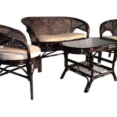 Комплект мебели для террасы 02/15 включает в себя: 2 кресла, плетеный двухместный диван, столик журнальный, подушки из материала улучшенного качества.